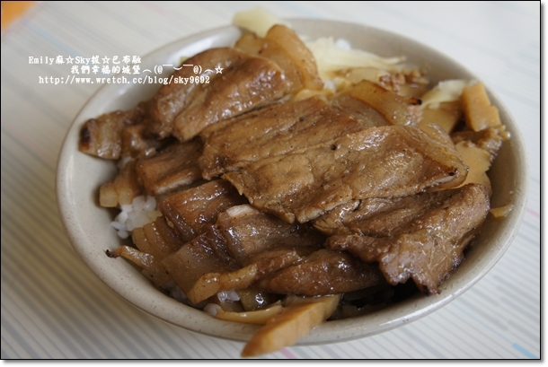 燒肉飯:肉採嫩肩里肌當燒肉片,加上獨自醬料淹漬,在透過炭烤後肉質不會太多油脂