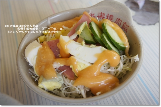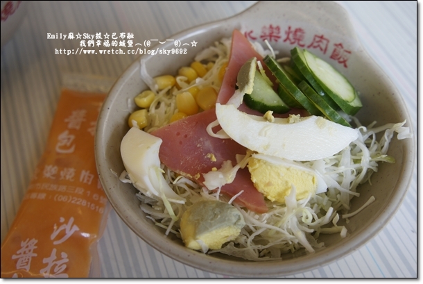 沙拉--- 高麗菜切絲+小黃瓜+玉米+火腿+水煮蛋(淋千島醬)