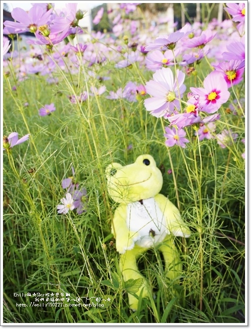 蛙蛙~舒服躺在粉紅色波斯菊花海下,好悠悠栽栽享受~真幸福