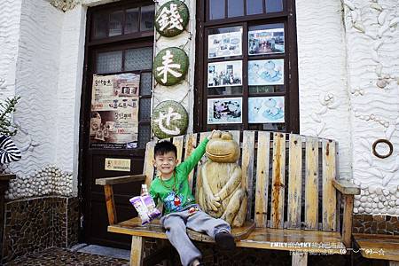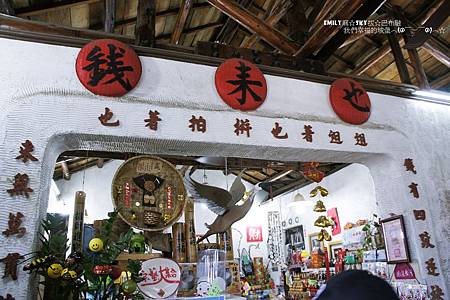 「錢來也」牆壁外觀是利用當地廢棄瓦片、貝殼、蚵殼鋪至而成,