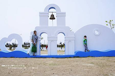藍白色希臘風的鐘聲幸福造景就在寬廣,吸引不少遊客前往拍攝留念喔~