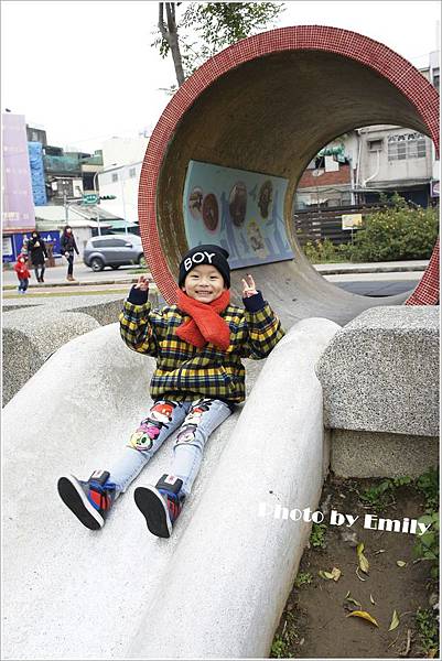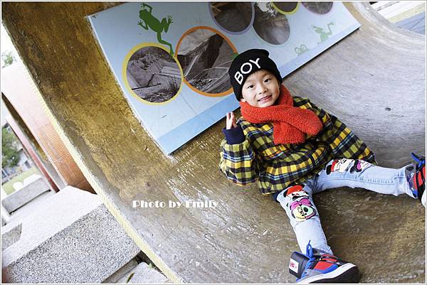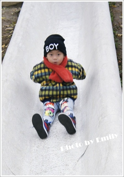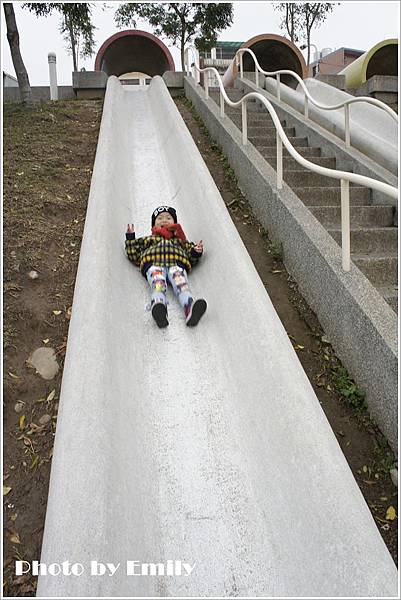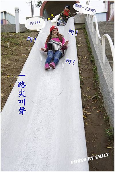 Emily一路滑下來一直叫到底啦~,旁邊小朋友一臉冏樣(阿姨!妳真誇張唷~)