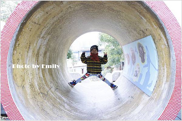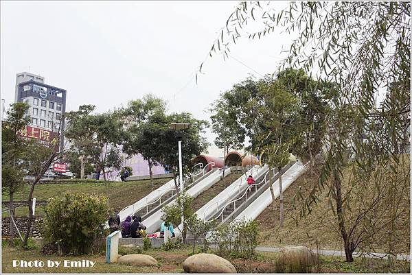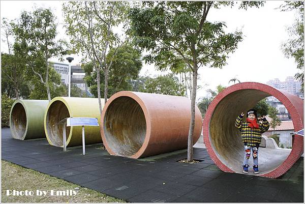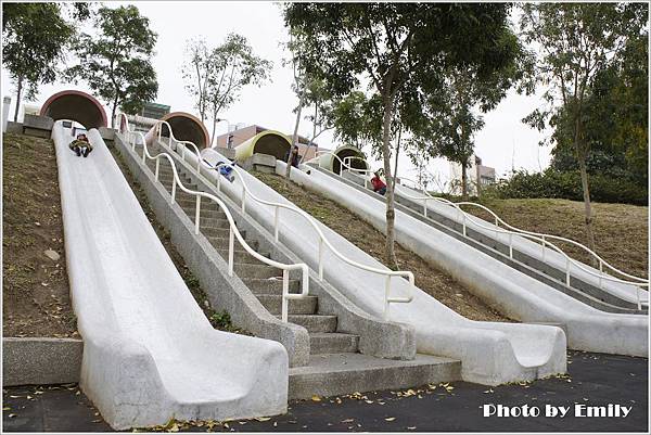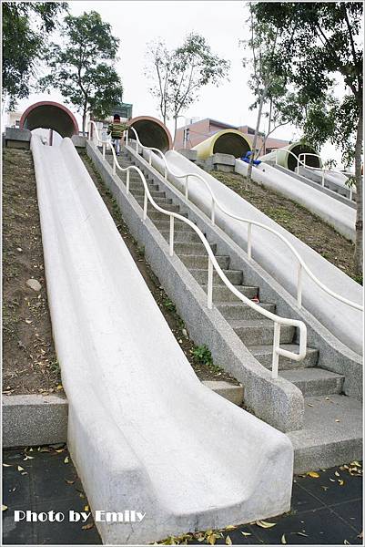 穿越水泥管後,哇哇哇~可見四座超長溜滑梯約有兩層樓高