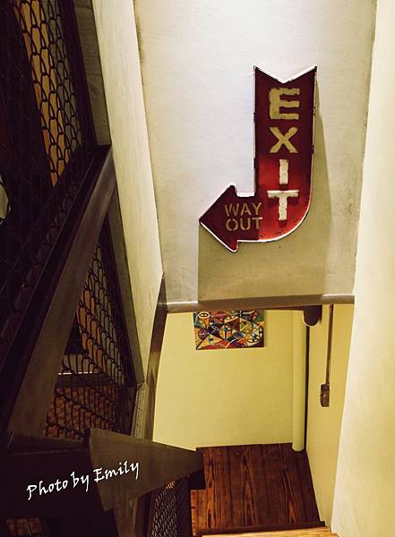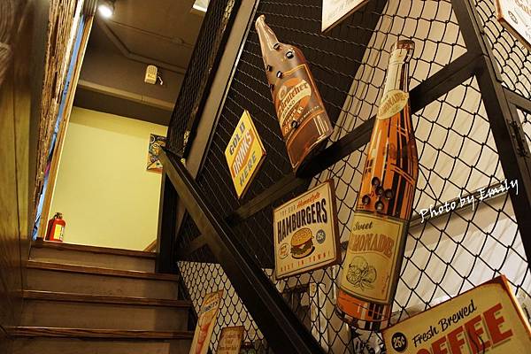 樓梯往2樓,樓梯空間藉由鐵網形式設計,還有店家收集美式品牌招牌