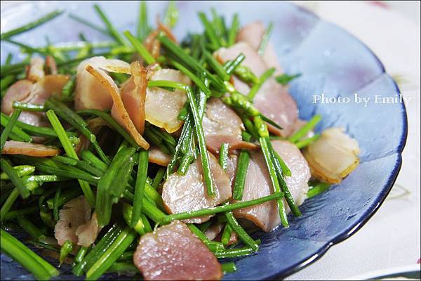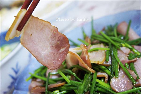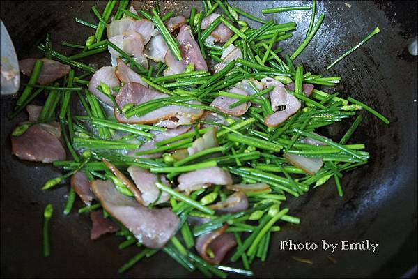 Emily將新鮮蒜苗搭配果木薰肉五花肉片下鍋炒到油油亮亮的,