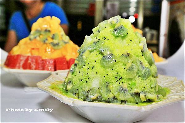 冰鑽打成脆冰,將奇異果肉切塊狀推疊滿滿滿,再淋上奇異果汁及煉乳