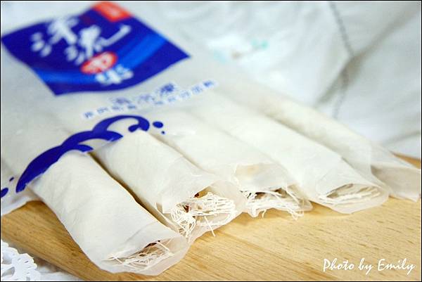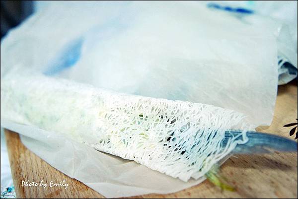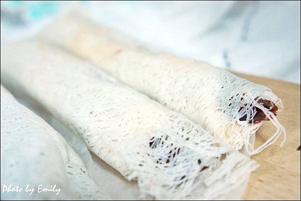 打開外層隔離用的油面紙後,可以看到獨特白色網狀米製的麵衣