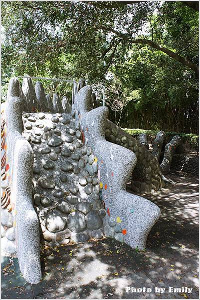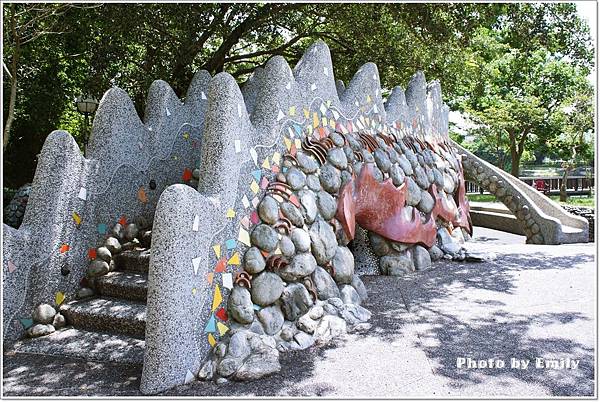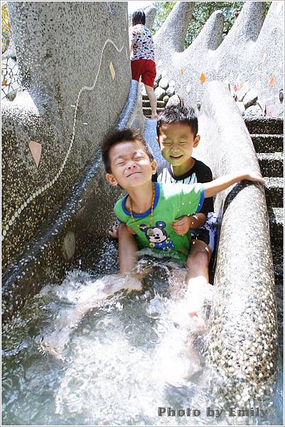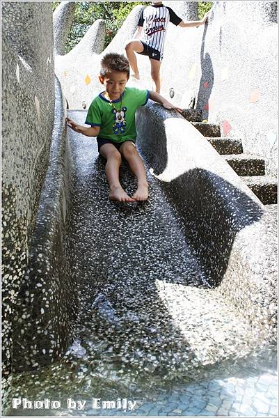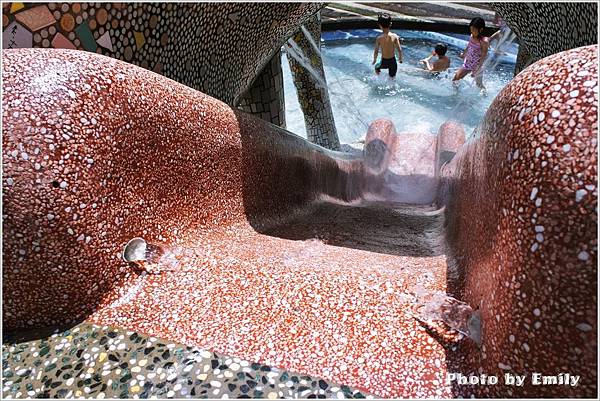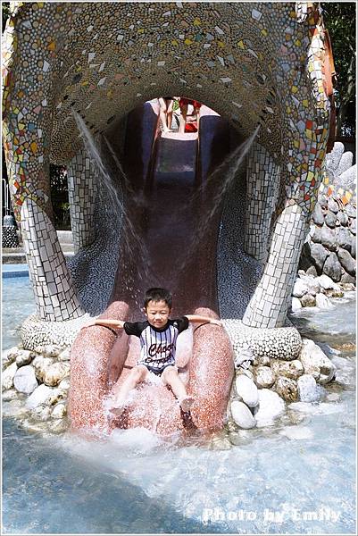 龍舌頭溜滑梯是以洗石子石頭打造溜滑梯,河道中還有水柱、噴霧和瀑布