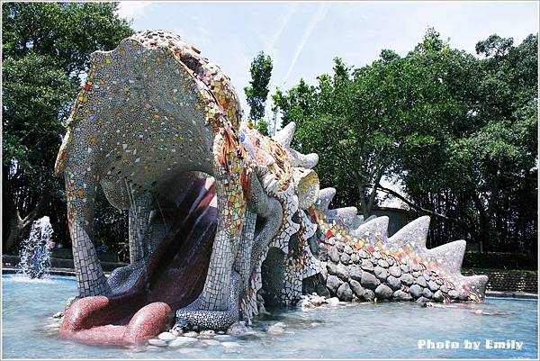 龍嘴巴溜滑梯,嘴巴舌頭兩旁加河道中還有水柱、噴水,
