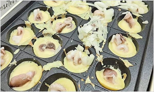 接著放進章魚塊,再鋪上高麗菜絲、洋蔥丁