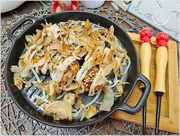 擺到盤子上後,先塗醬汁、再擠美乃滋、撒上柴魚片